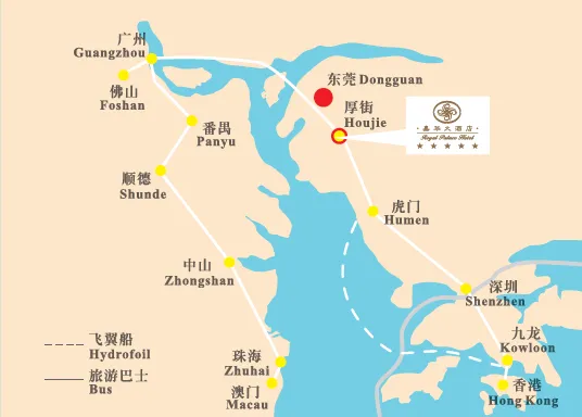 酒店地理位置优越,毗邻广东现代展览中心,距深圳机场35分钟车程,距广州机场60分钟车程,距虎门港15分钟车程,距虎门大桥38分钟车程,距港珠澳大桥2小时车程,东莞地铁2号线站点直通酒店车场,4分钟可到虎门高铁站,从虎门高铁到香港西九龙站仅30分钟,交通便利,四通八达。